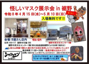 - 『怪しいマスク展示会in裾野』開催!被る!戦う!よりも飾る!鑑賞する!ことに重きをおいた派手なマスクを裾野市のレストランで展示します。日程:4月1… 続きを読む: 『怪しいマスク展示会in裾野』開催!